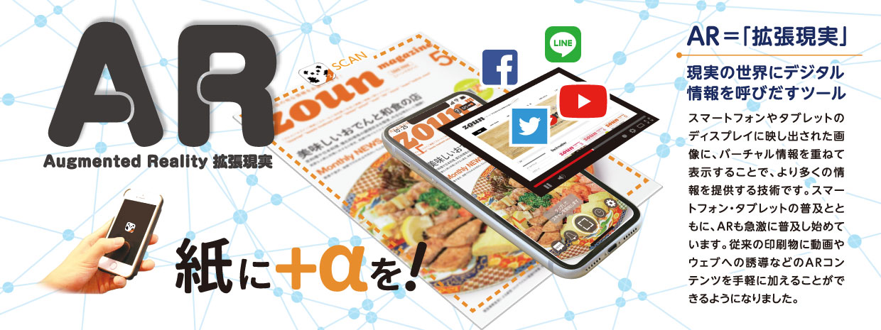 スマートフォンやタブレットを活用して、従来の印刷物に動画やWEBへの誘導・GPS機能を使ったスタンプラリー・Unityとの連動で3Dキャラクターを利用したSNS拡散などARコンテンツを手軽にご利用いただけます。