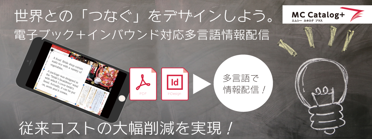印刷物のデータ(Indesign・PDF)を活用し、スマホ・タブレット端末アプリ「カタポケ」に手軽に配信できるクラウドサービスです。「MC Catalog+」で自動翻訳エンジンと連携することで、日本語を含め7言語による多言語コンテンツの同時配信が可能になります。